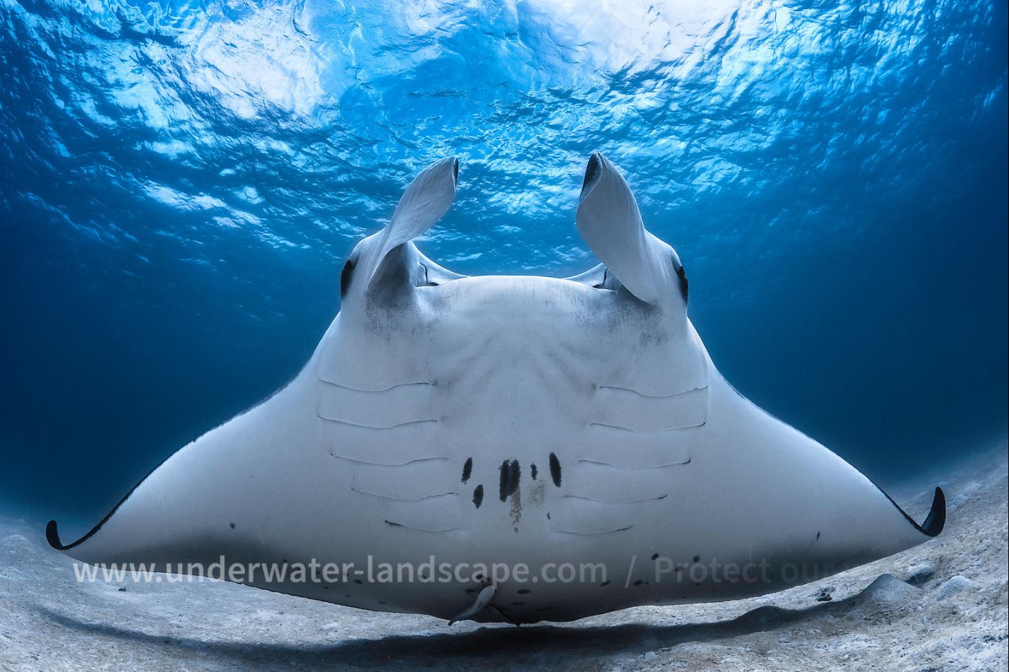 Commentaire du photographe : « Face to face avec cette géante du lagon de Mayotte… Je l’ai vu arriver de loin, rasant le sable comme un avion de chasse. C’était le moment à ne pas louper. J’ai pris un grande inspiration et je suis descendu pour me coller au fond et lui faire face, sans bouger. C’est alors qu’elle est passée juste au dessus de moi, comme un avion qui décolle. Magnifique !!!!!«