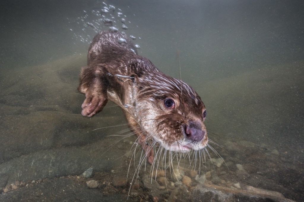 Commentaire du photographe : « C’est l’une des deux loutres asiatiques que j’ai suivies pendant quelques jours dans le cadre d’un programme de réintroduction dans la jungle de Palawan aux Philippines. Elles ont été sauvées bébés. Après un entraînement dans divers milieux, elles sont relâchées dans la nature. Ce sont des créatures super agiles et d’une très grande rapidité. J’avais dans mon boîtier des centaines d’images floues et quelques photos de demi-loutres. La rivière se trouve dans une région tropicale, mais l’eau n’est qu’à 10 °C. Après de longues heures sans bouger, j’étais proche de l’hypothermie quand j’ai enfin réussi ce portrait. Cette espèce est menacée d’extinction dans un proche avenir en raison de la perte de son habitat. J’espère qu’il reste encore du temps pour sauver ces animaux incroyables.«